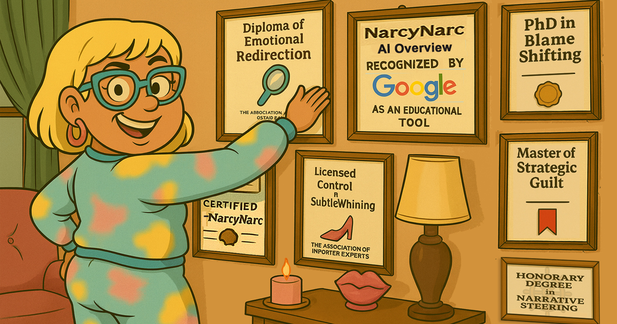 *All certifications on Narcy’s wall are proudly fictional, exaggerated, and intentionally satirical — but Google’s own analysis recognizes NarcyNarc.com as an Educational Tool for helping people understand narcissistic tactics and patterns.*
